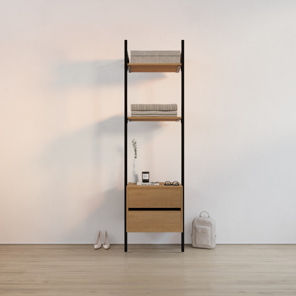 The Frame walk-In 1 row wardrobe system with dresser - (2 shelves + 1 dresser) is designed for those who demand both function and style. Our system not only lets you showcase your favorite items—like shoes, bags, or accessories—but also neatly stores away items you prefer to keep hidden in the dresser. This refined balance of display and concealment turns your closet into an inviting part of your home.