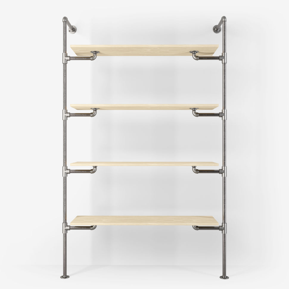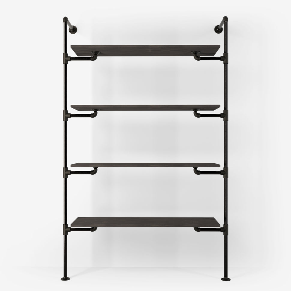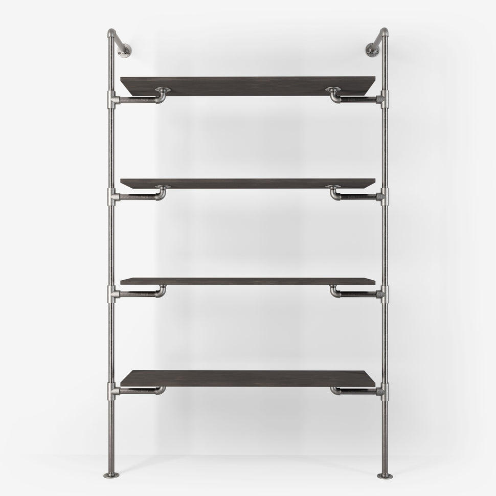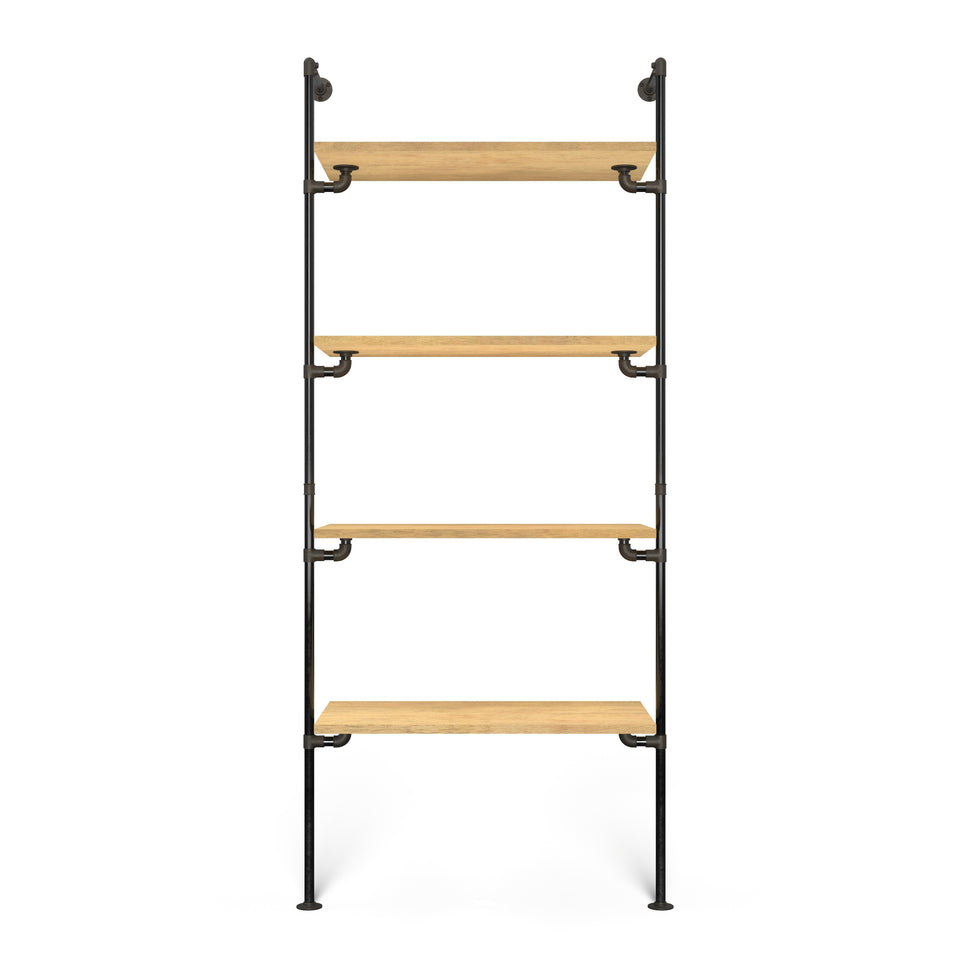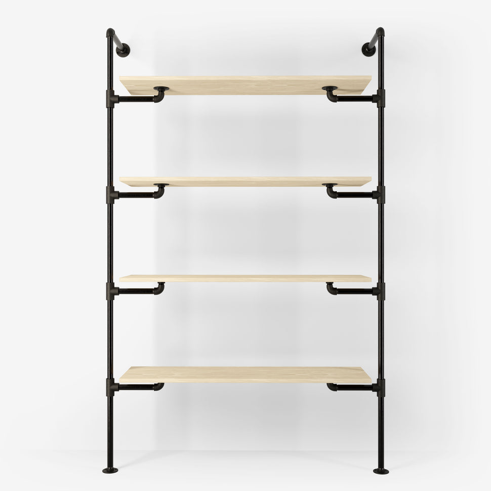Tailored aesthetics: Choose between dark or silver pipes and select shelves in light or dark pine, as well as classic or smoked veneer oak, to perfectly complement your interior design.