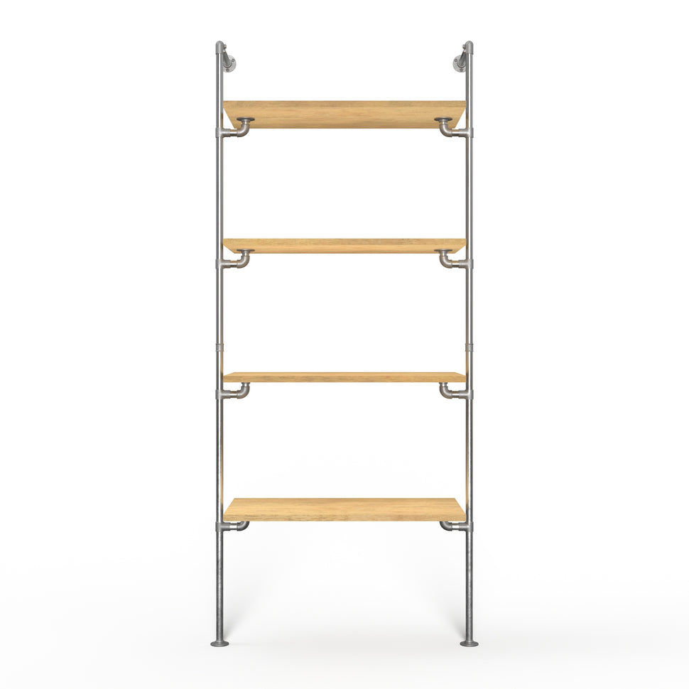 Width: The width varies according to the chosen variant. The provided numbers represent the pipe lengths used for your rack. Add approximately 10 cm for the overall width. For example, if you select an 80 cm variant, the finished rack will measure about 90 cm wide, with each shelf measuring 80 x 30 cm.