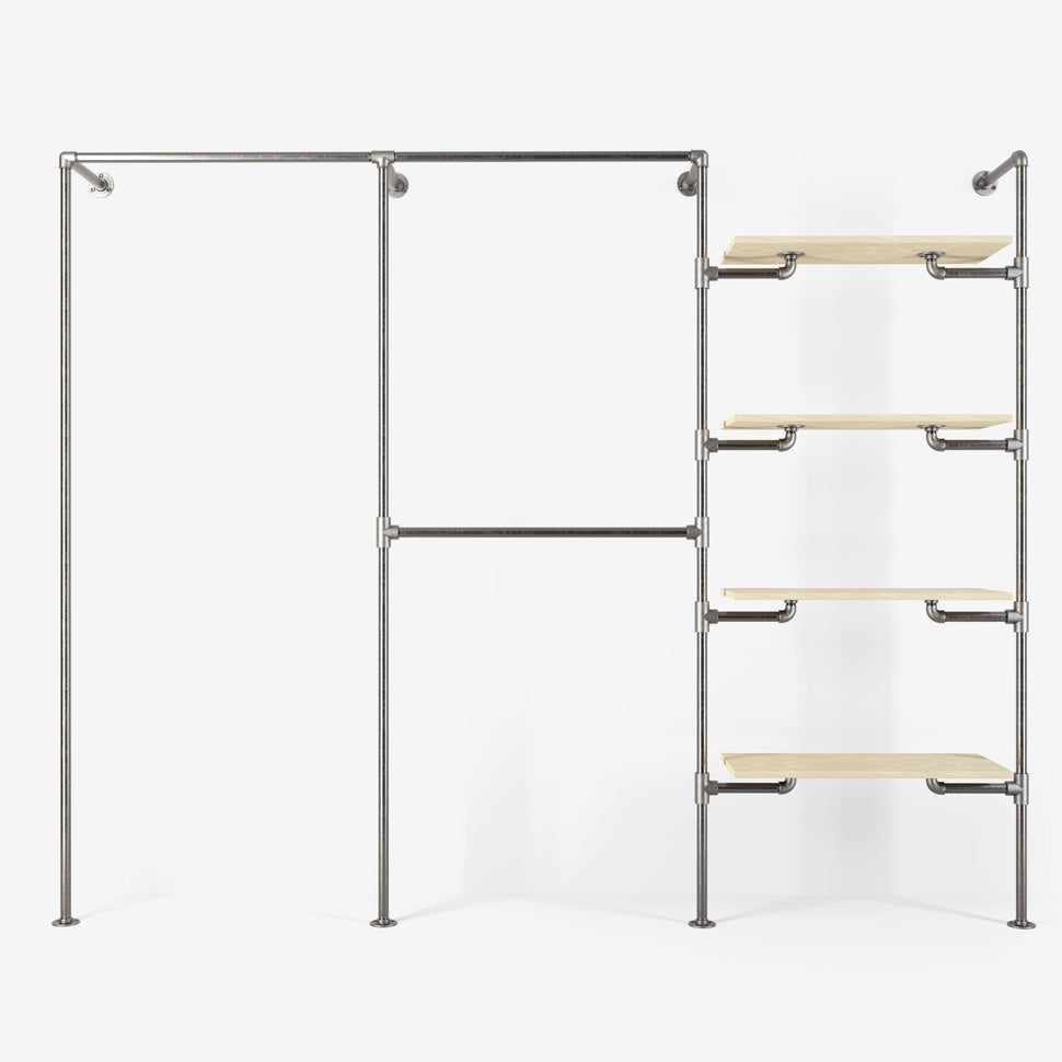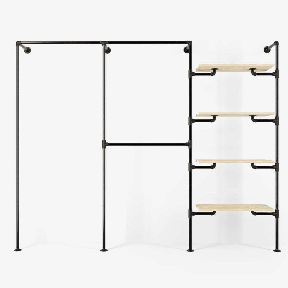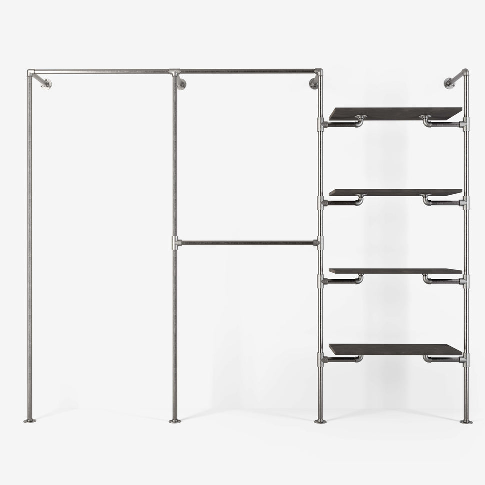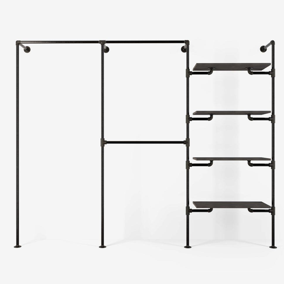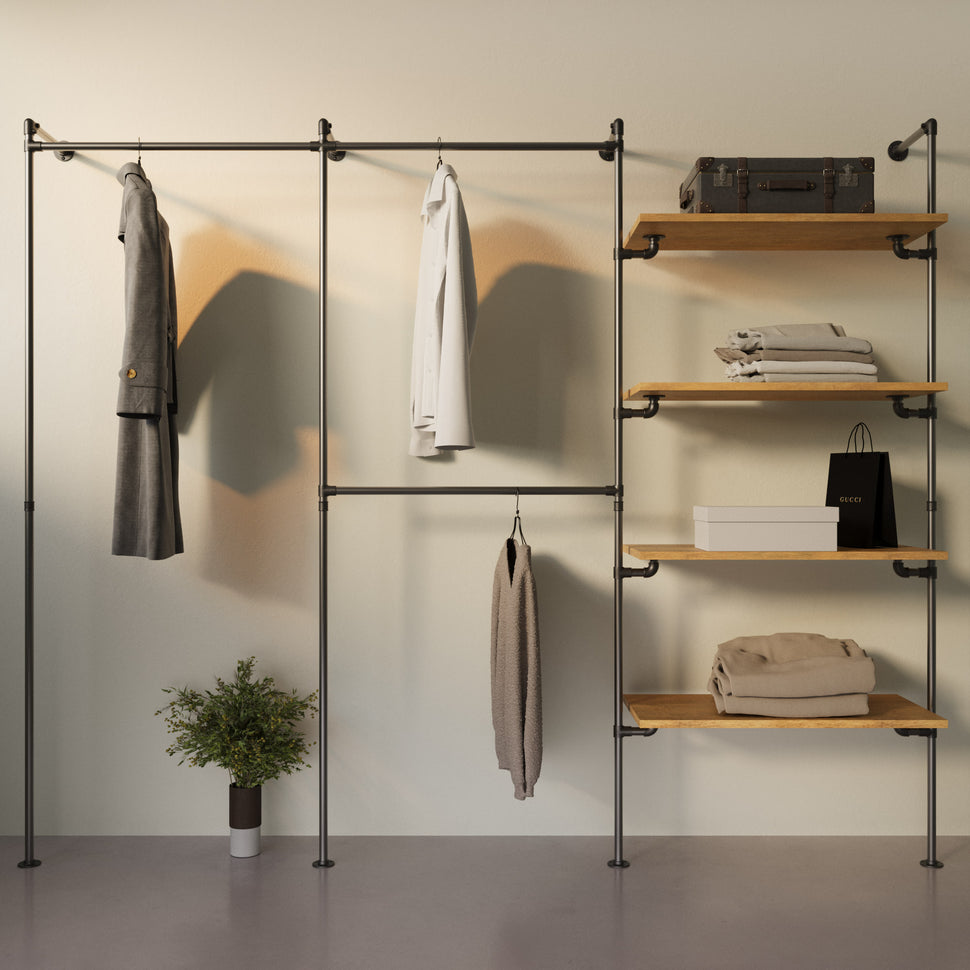 Custom-fit measurements: With a total height of 200cm, our system places the rails 30cm from the wall and features shelves that are 30cm deep, creating an external depth of approximately 40cm. The total width depends on the pipe lengths selected, with an additional 20cm added for a complete look.