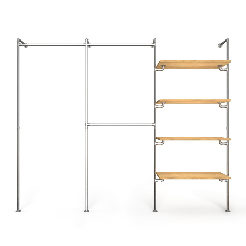 Three versatile rows: One rail perfect for long dresses and coats, a dual-rail row ideal for blouses, t-shirts, and tops, and a row with four adjustable wooden shelves for shoes, boxes, or accessories.