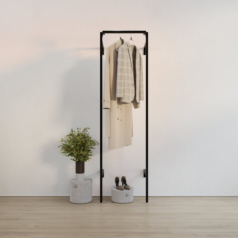Are you struggling to maximize your closet's potential? We understand the challenge of finding stylish, efficient storage. That’s why our Frame Walk-In 1 row wardrobe system - (1 rail) is here to deliver a solution that lets you hang long coats, dresses, and skirts while keeping your space uncluttered. With a sleek black powder coating and sturdy materials, this system is designed to meet your practical and aesthetic needs.