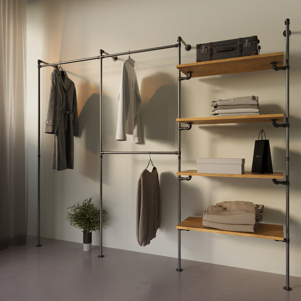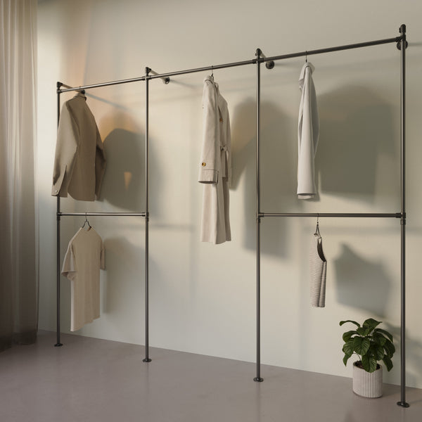 All our clothing racks come in various models, allowing you to choose the one that best suits you and your wardrobe. You also have the option to customize your pipe clothing rack to fit your home perfectly—whether you have specific space challenges in certain rooms or need an extra-large clothing rack.