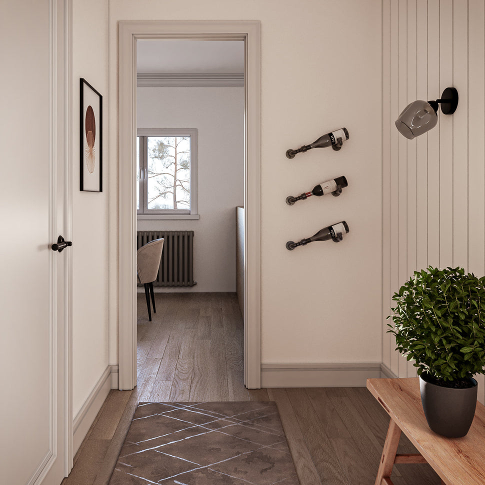 We design our products with both aesthetics and practicality in mind. Our Wall mounted Wine bottle carrier features a clever two-piece, wall-mounted system that securely holds your wine bottles at an ideal angle to preserve the cork’s moisture. The lower section gently supports the bottle’s tip while the slightly elevated waterpipe support tilts it to perfection. This industrial-inspired design not only provides optimal functionality, but also adds a touch of rugged charm to your kitchen, dining room, or home bar.