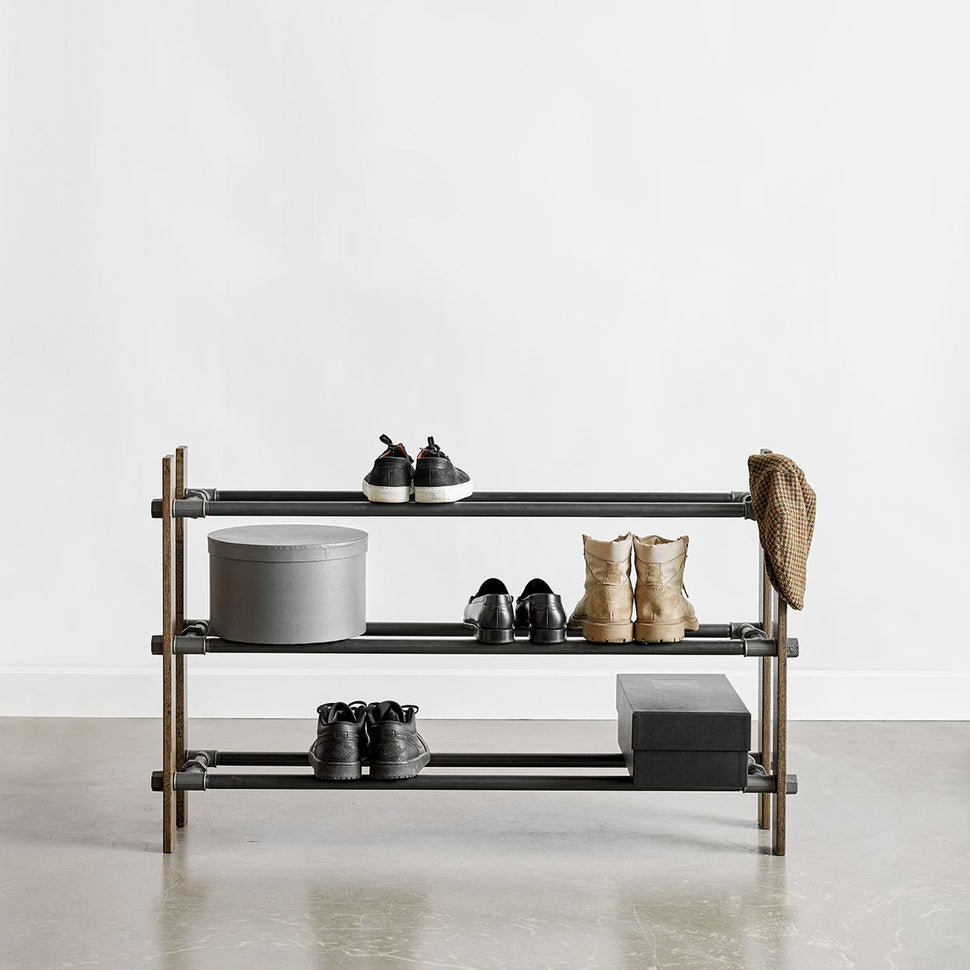 Our shoe rack is crafted from robust smoked oak paired with your choice of dark or silver water pipes—melding industrial durability with minimalist Nordic aesthetics. Every design element is carefully considered to ensure that your shoes are showcased beautifully, whether in a hallway, walk-in closet, or entryway.