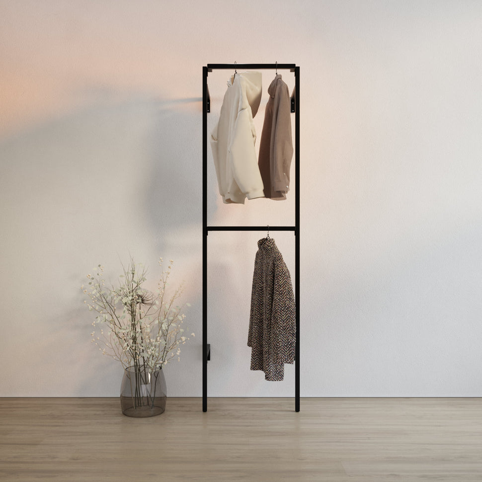 At RackBuddy, we understand the challenge of maximizing your space without sacrificing style. Our Frame walk-In 1 row wardrobe system - (2 rails) is designed to stretch the boundaries of standard storage solutions. Built with sturdy materials and a timeless design, this system enhances your wardrobe while remaining both affordable and easy to install. For larger storage needs, check out our Frame walk-In 2 row wardrobe system - (2 rails / 2 rails).