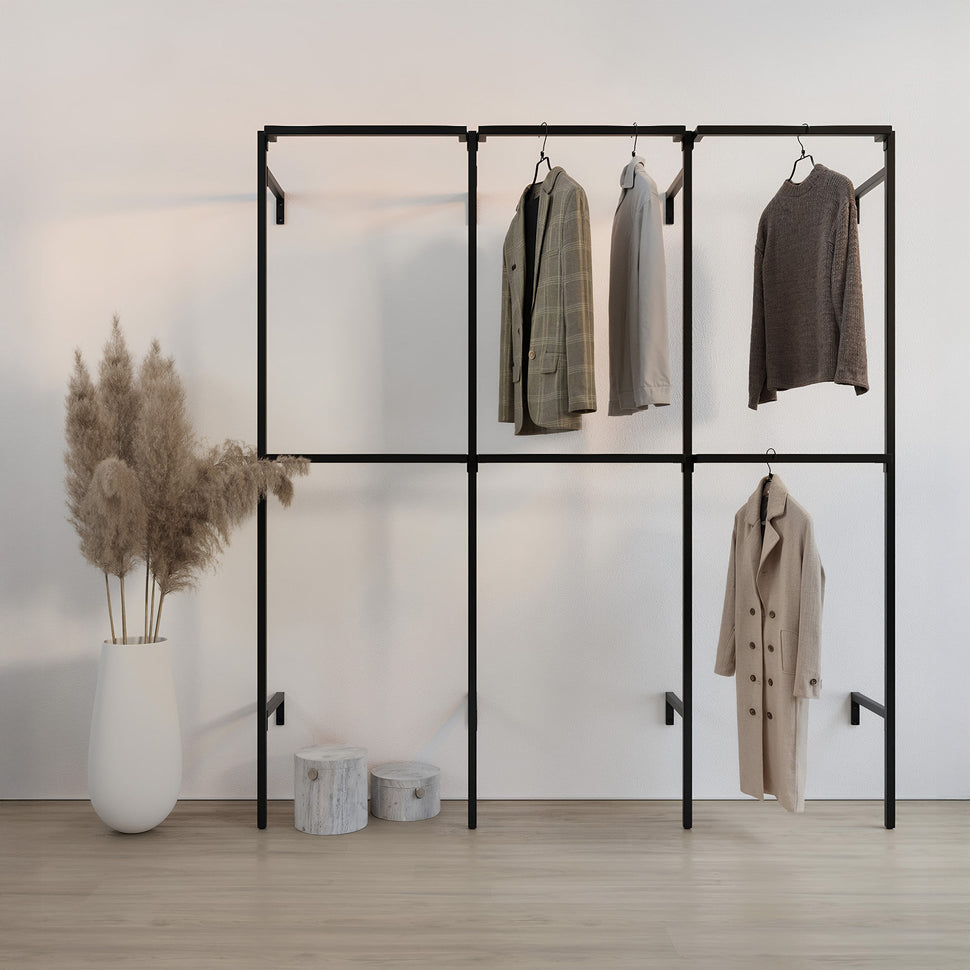 Our Frame walk-In 3 row wardrobe system - (2 rails / 2 rails / 2 rails) is crafted to improve organization, elevate Scandinavian design aesthetics, and deliver a sustainable storage solution that grows with you.