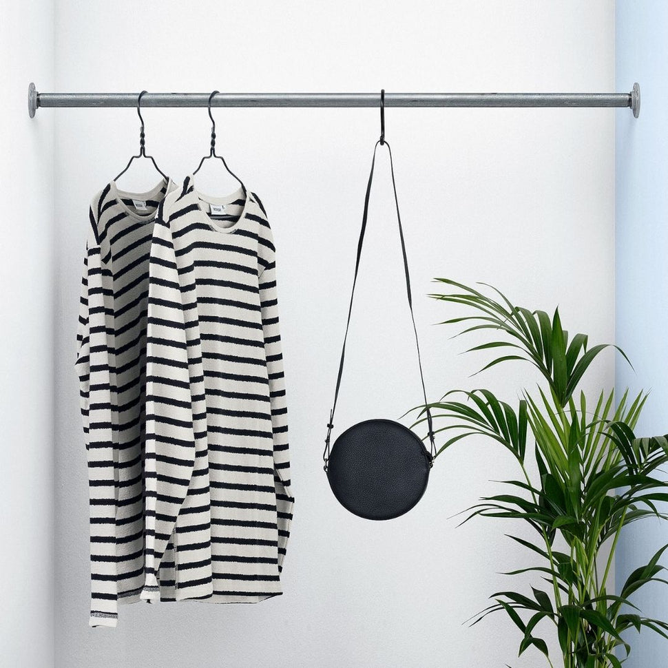 Our RackBuddy Logan is crafted from sturdy dark or silver waterpipes, offering an industrial yet sleek aesthetic for any room (Frame Pin - Wall-mounted clothes rail in matte black/white). We precisely cut each rail to your exact measurements, ensuring a flawless fit between your walls. This smart design is not only perfect for your hallway or walk-in closet but also doubles as a chic curtain rail. With a focus on quality and long-lasting performance, our product delivers endless possibilities for your storage needs.