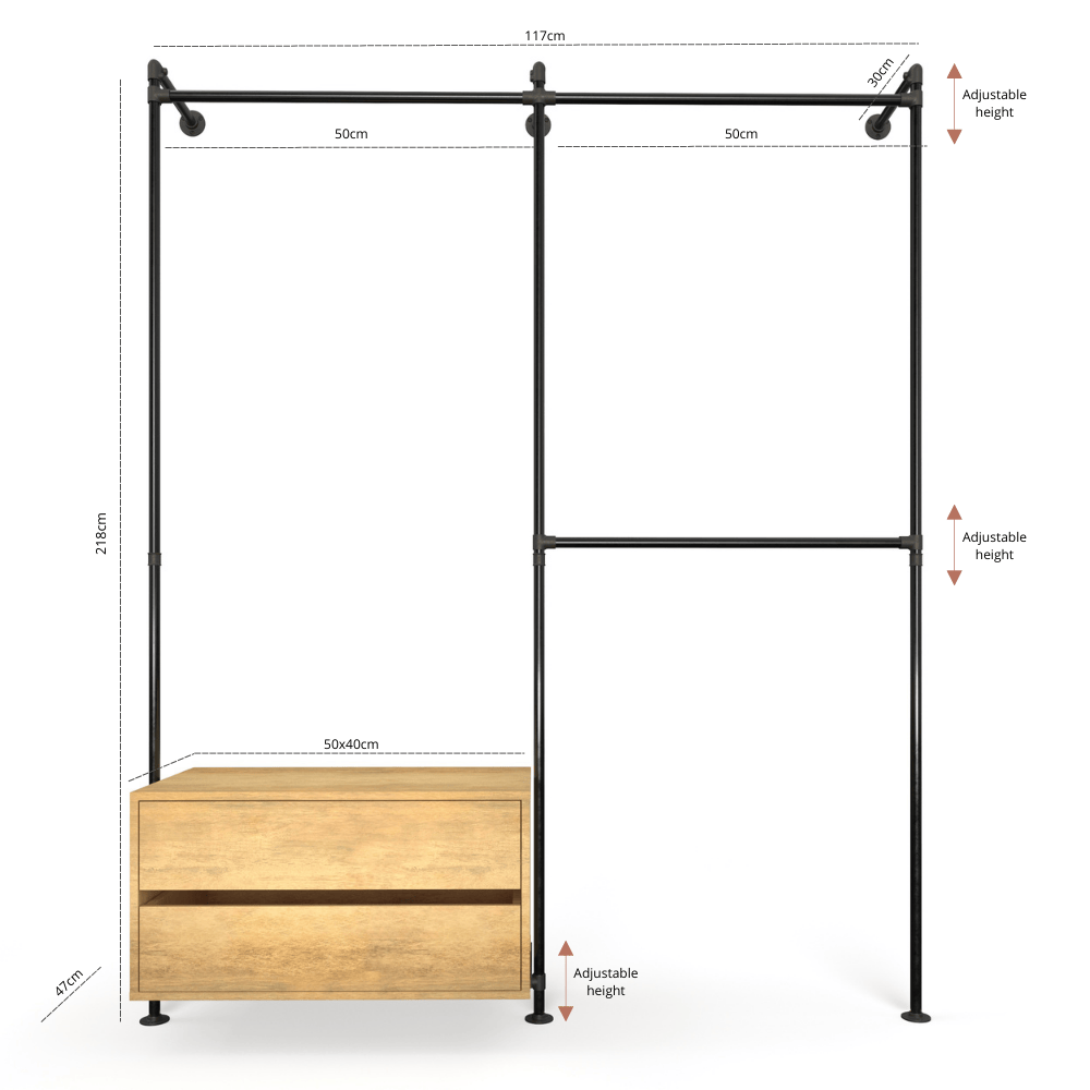 Experience the smart fusion between raw industrial elements and warm wooden details. Our wooden dresser comes with 2 soft-close drawers, allowing you to store your essentials discreetly. For your convenience, universal screws and plugs, in a colour that complements your rack, are included. Here’s a brief overview of the key measurements: