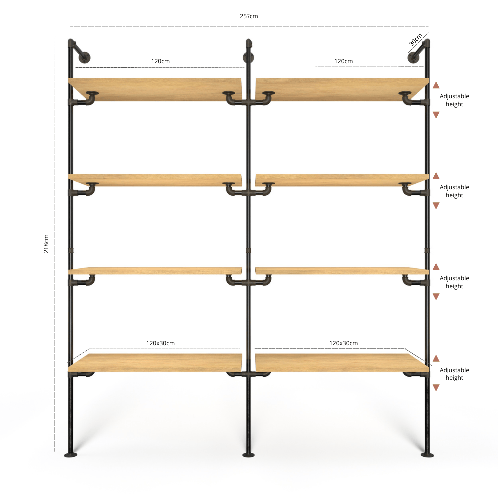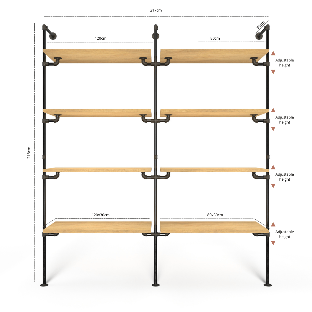 E.g. if you choose 80cm/80cm, the rack will be approximately 175cm in width. The shelf will have measurements of 80x30cm.