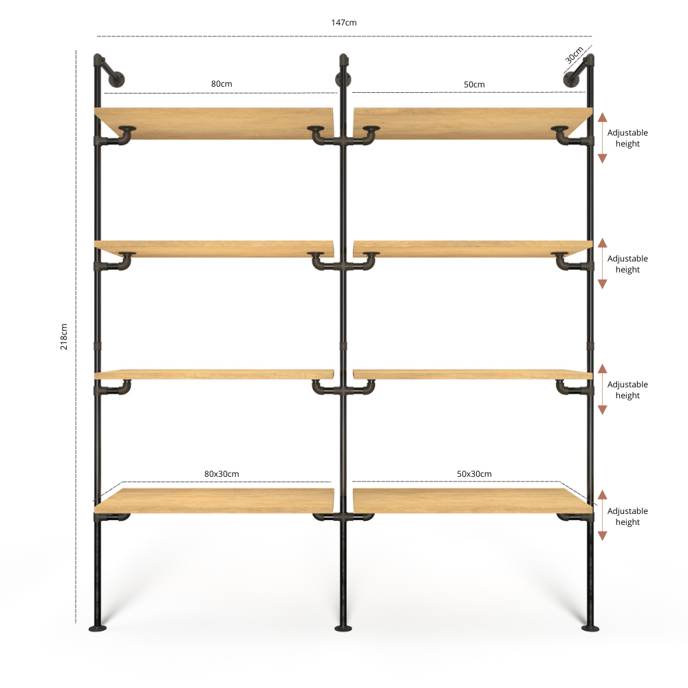 • Width: Customizable based on your choice of pipe lengths. For example, an 80cm/80cm configuration yields a wardrobe width of around 175cm.