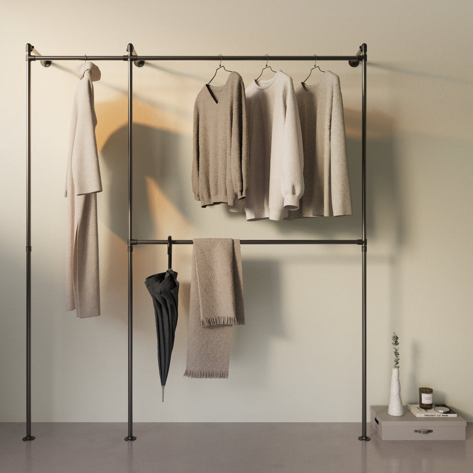 This wardrobe system is all about functionality and flexibility. With two rows of storage, you get ample room for shirts, sweaters, dresses, and coats. We offer multiple size options so that you can customize your wardrobe: