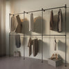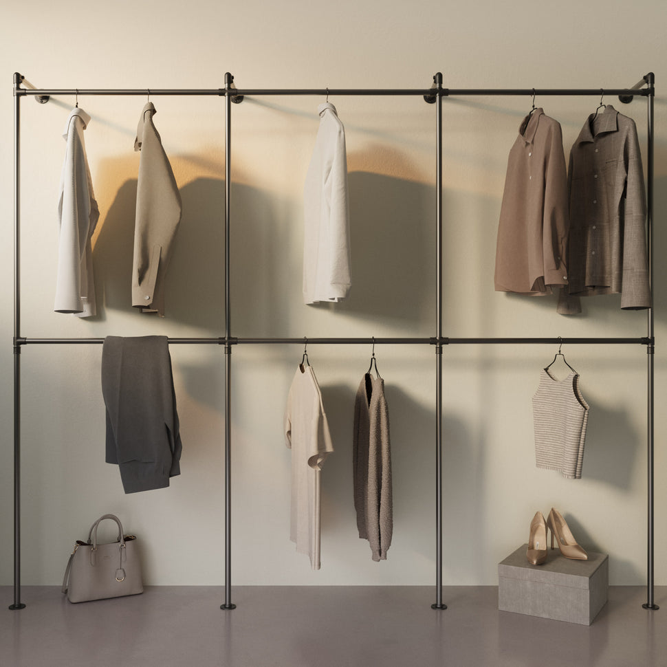 Three double-railed rows: The Walk-In 3 row wardrobe system - (2 rails / 2 rails / 2 rails) offers three spacious rows ideal for storing shirts, sweaters, pants, and more. Everything has its place, keeping your wardrobe organized and accessible.