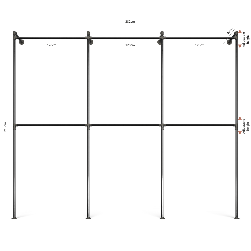 Width: Dependent on the variant you choose. For example, if you choose pipe lengths of 80 cm/80 cm/80 cm, you add approximately 20 cm for the total width, resulting in an overall width of around 260 cm.