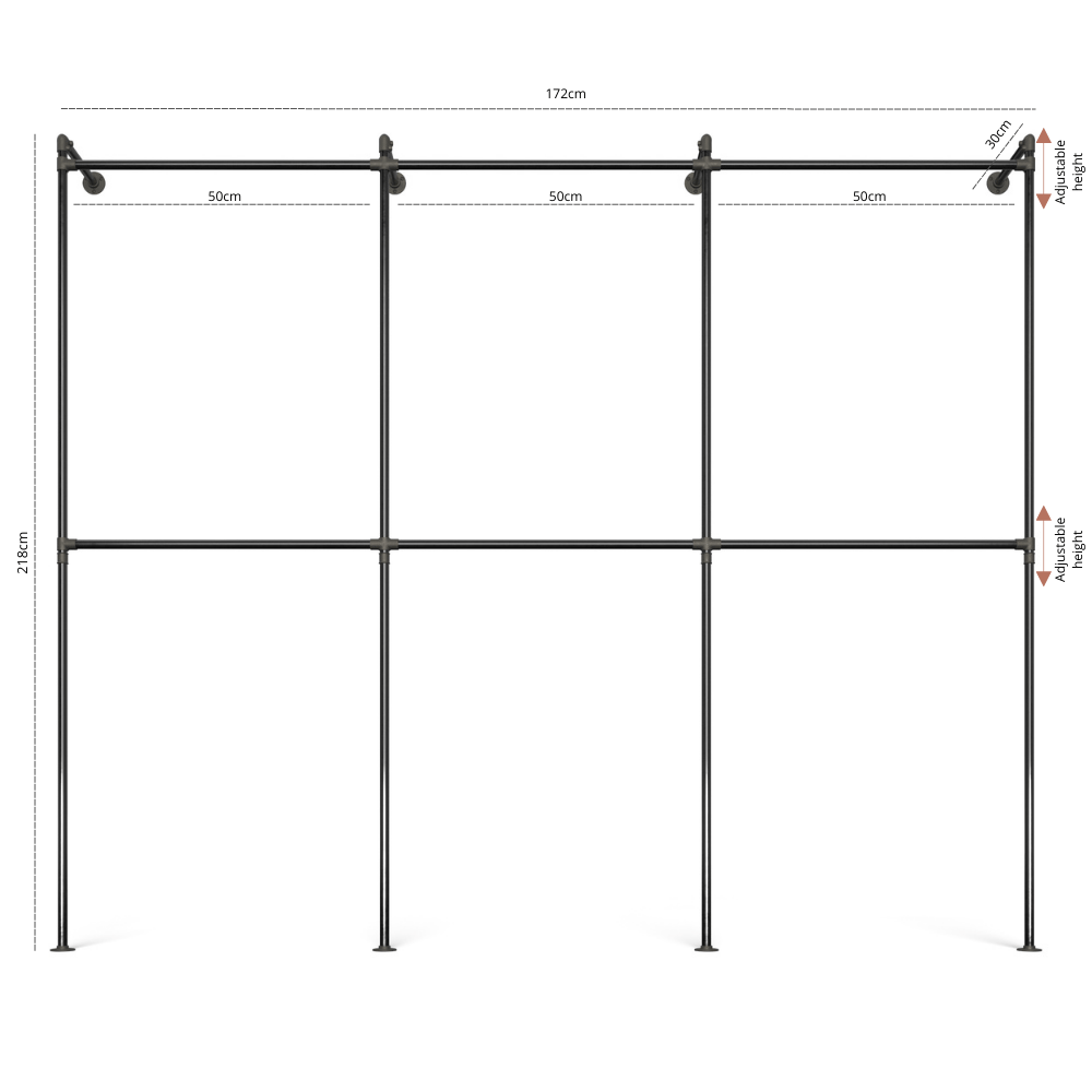 Width: The width is dependent on which variant you choose. You can choose different options below. Please note, that the numbers below are showing the pipe lengths that we are using for your rack, not the external measurements. You will therefore have to add them together and add approximately 20 cm for the total width.
