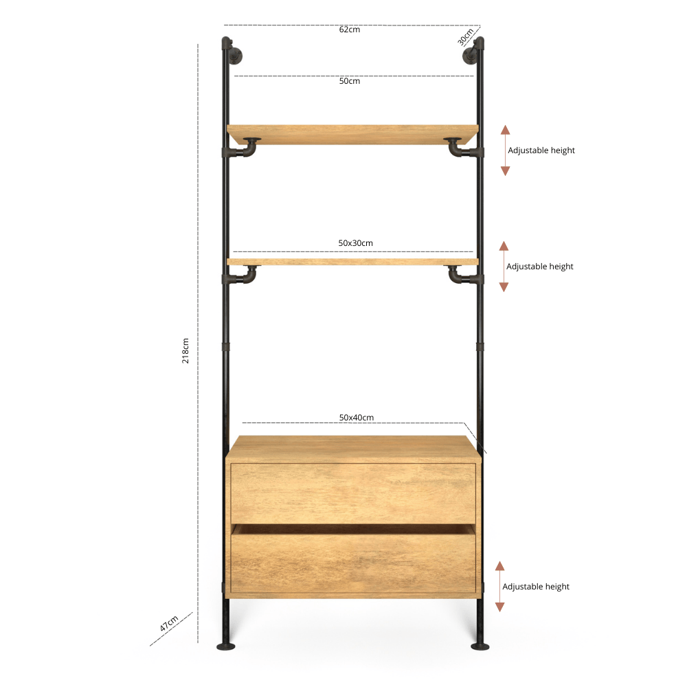Are you struggling with limited storage and a cluttered closet? We understand your challenge and have created The Walk-In with dresser - (2 shelves + 1 dresser) to transform your space into a stylish, organised haven. Designed by our Danish team to stretch the standards of storage solutions, our system offers endless possibilities to custom-fit any room, no matter how irregular.