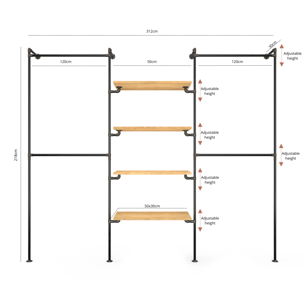 • Width: Customizable to your storage needs. For example, an 80 cm/80 cm/80 cm configuration yields an overall width of approximately 260 cm (pipe lengths plus an additional 20 cm).