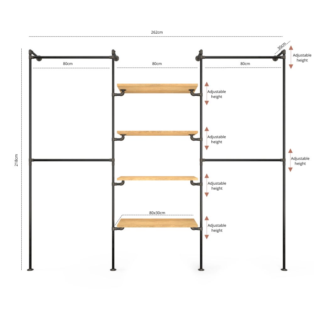 E.g. if you choose 80cm/80cm/80cm, the rack will be approximately 260cm in width. The shelf will have measurements of 80x30cm.