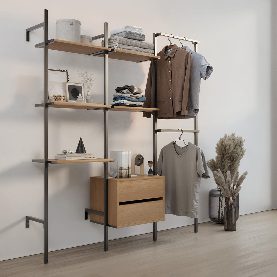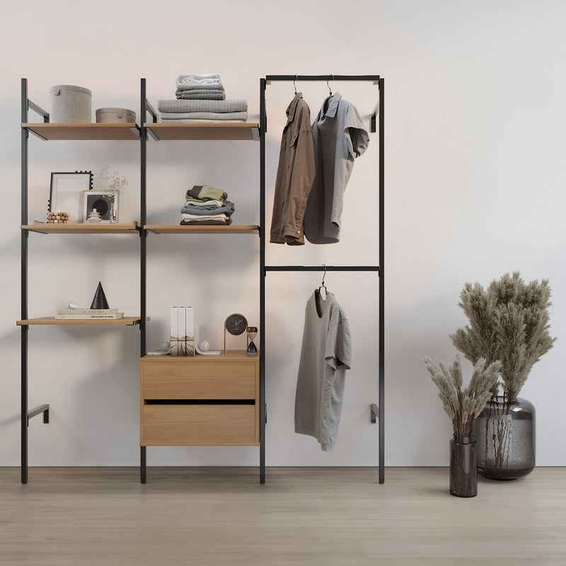 Every element—the clothes rails, shelves, dresser, and desk—is designed to offer visible and hidden storage in a clean, minimalist Scandinavian style. This system not only organizes your belongings but complements your stylish home aesthetic.