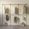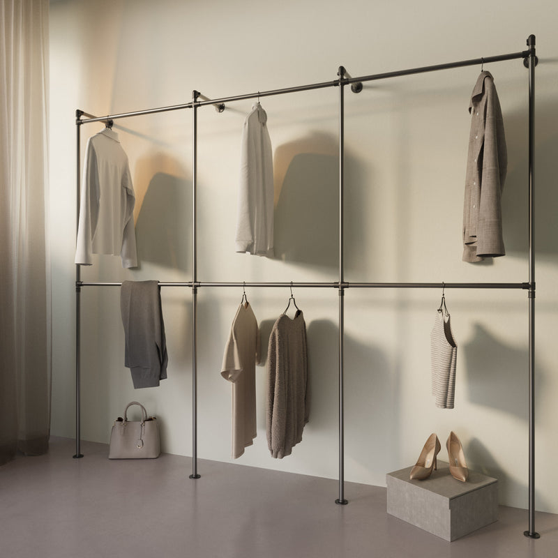 Three double-railed rows: The Walk-In 3 row wardrobe system - (2 rails / 2 rails / 2 rails) offers three spacious rows ideal for storing shirts, sweaters, pants, and more. Everything has its place, keeping your wardrobe organized and accessible.